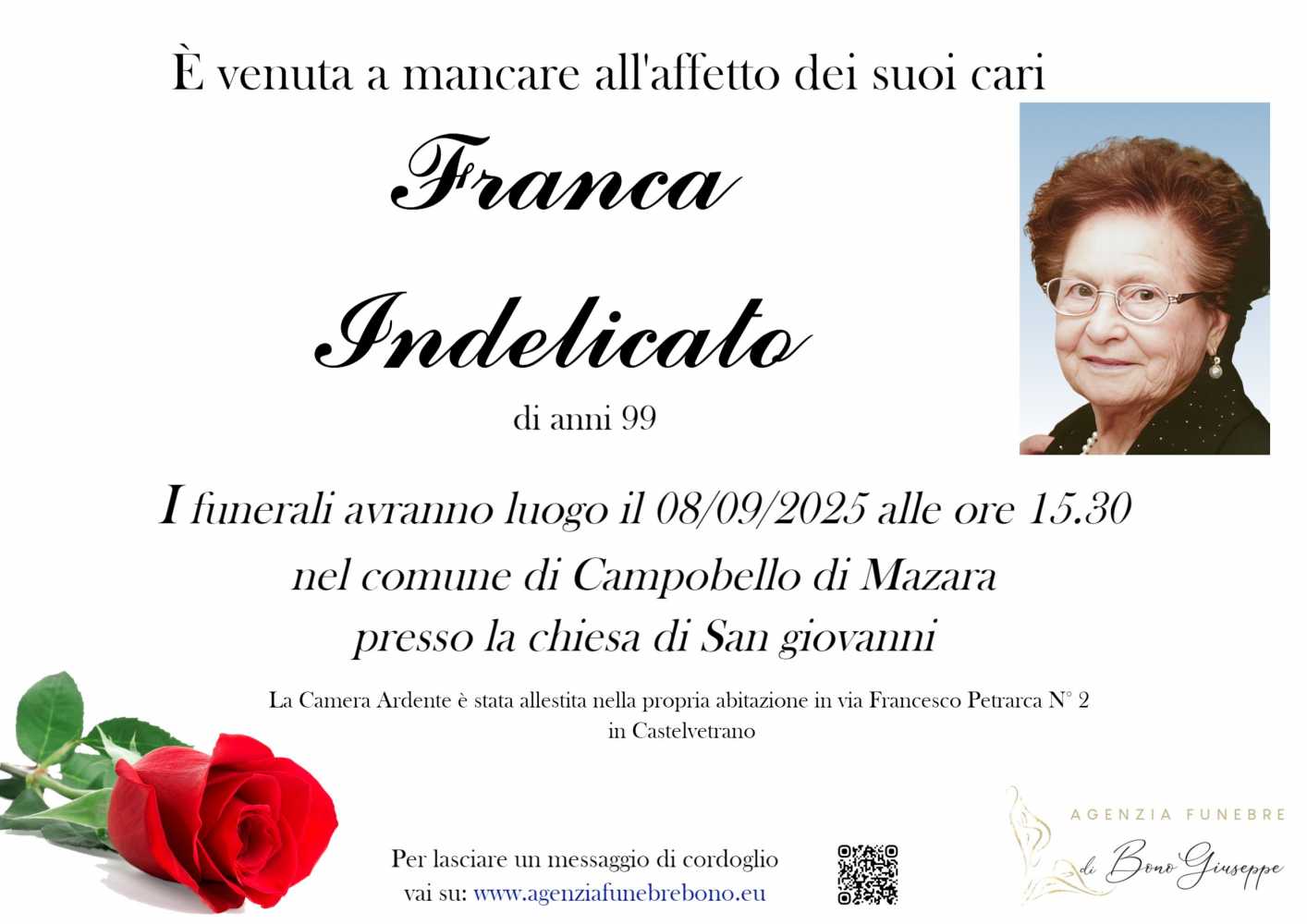 Lascia gratuitamente un messaggio di cordoglio, sarà nostra cura consegnarlo ai congiunti di Franca Indelicato.