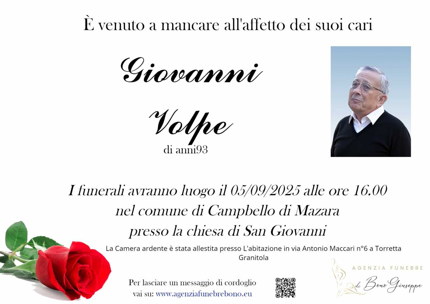 Lascia gratuitamente un messaggio di cordoglio, sarà nostra cura consegnarlo ai congiunti di Giovanni Volpe.