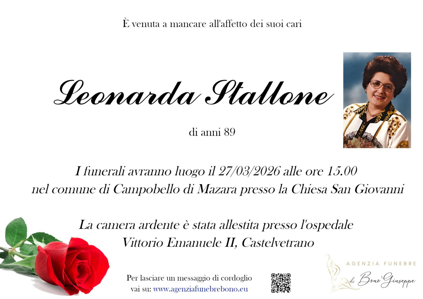 Lascia gratuitamente un messaggio di cordoglio, sarà nostra cura consegnarlo ai congiunti di Leonarda Stallone.