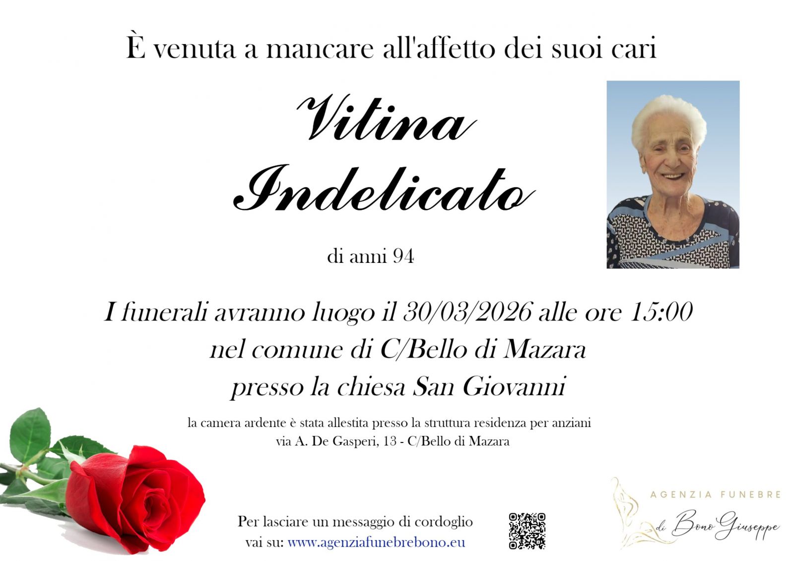 Lascia gratuitamente un messaggio di cordoglio, sarà nostra cura consegnarlo ai congiunti di Vitina Indelicato.